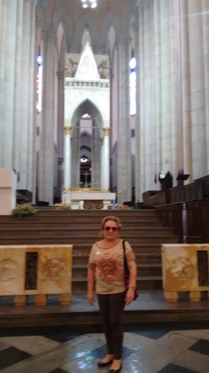 Do Parque do Ibirapuera fomos para a Catedral da Sé. No percurso fomos conhecendo a cidade de SP. Adorei o Bairro Jardins. Um verdadeiro jardim. Lindas residencias e muito verde. A Catedral Metropolitana de São Paulo fica na Praça da Sé. A praça é ampla e muito movimentada. Chegamos na Igreja na metade da missa do meio dia. Recebemos a benção final e água benta que o sacerdote ungiu os fiéis presentes.